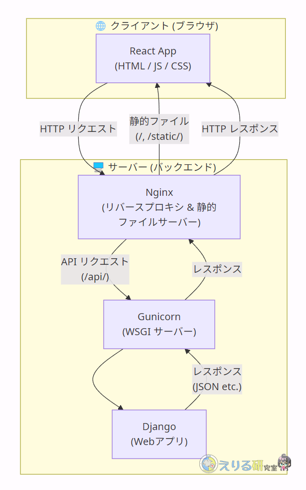 • Django → Gunicorn → Nginx → ブラウザ という経路でレスポンスが返ります。